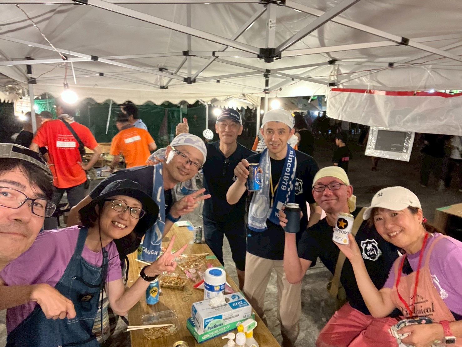 昨年に引き続き地元自治会の夏祭りに参加。おやじの会で購入したグリーン屋根のテントを午前中に設営。16時からたこせんを販売しました。 たこせん1つで100円という安価設定のお陰で飛ぶように売れました。19時には400食を売り切り初日分は完売になりました。 2日目は、小さい子供達のために、たこせんを半分にして50円で販売。半分にする事で一手間増えましたが、荏田高校の生徒会とジャグリング部から4名の助っ人に協力してもらいました。18:30には、早くも400食完売となりました。その後、お祭りが終わるまでテント内で宴会となりました。